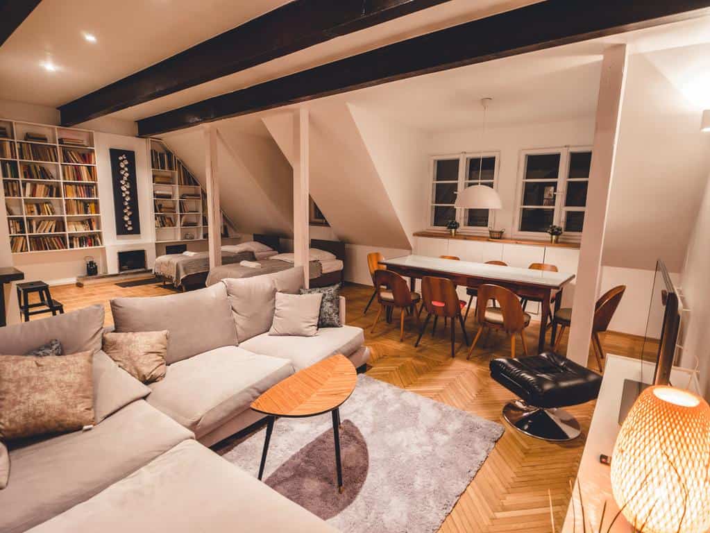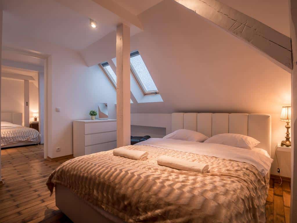 W Unique Penthouse na Starym Mieście może spać 8 osób. Można się uprzeć na 10, jeśli wykorzysta się kanapę w salonie. W części dziennej, oprócz wspomnianej kanapy, znajdują się dwa jednoosobowe, dosyć wąskie łóżka. Na piętrze jedyna zamknięta sypialnia z dużym dwuosobowym łóżkiem oraz drugie podwójne łóżko w części otwartej. Ostatni poziom to bardzo niskie poddasze z podwójnym łóżkiem.